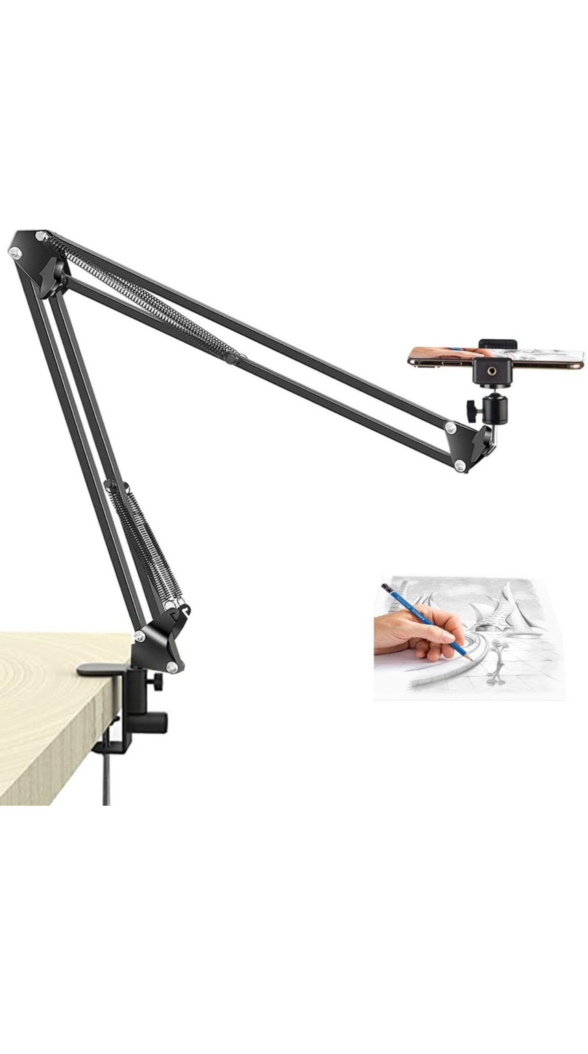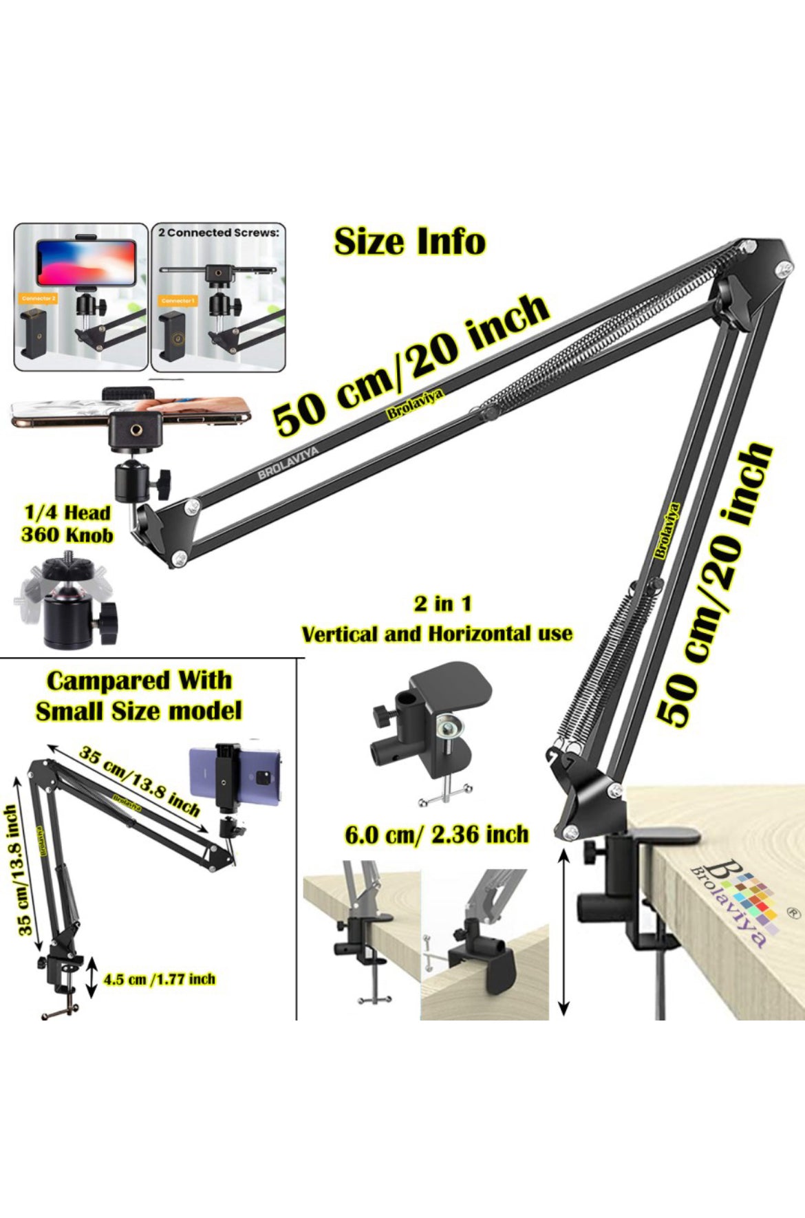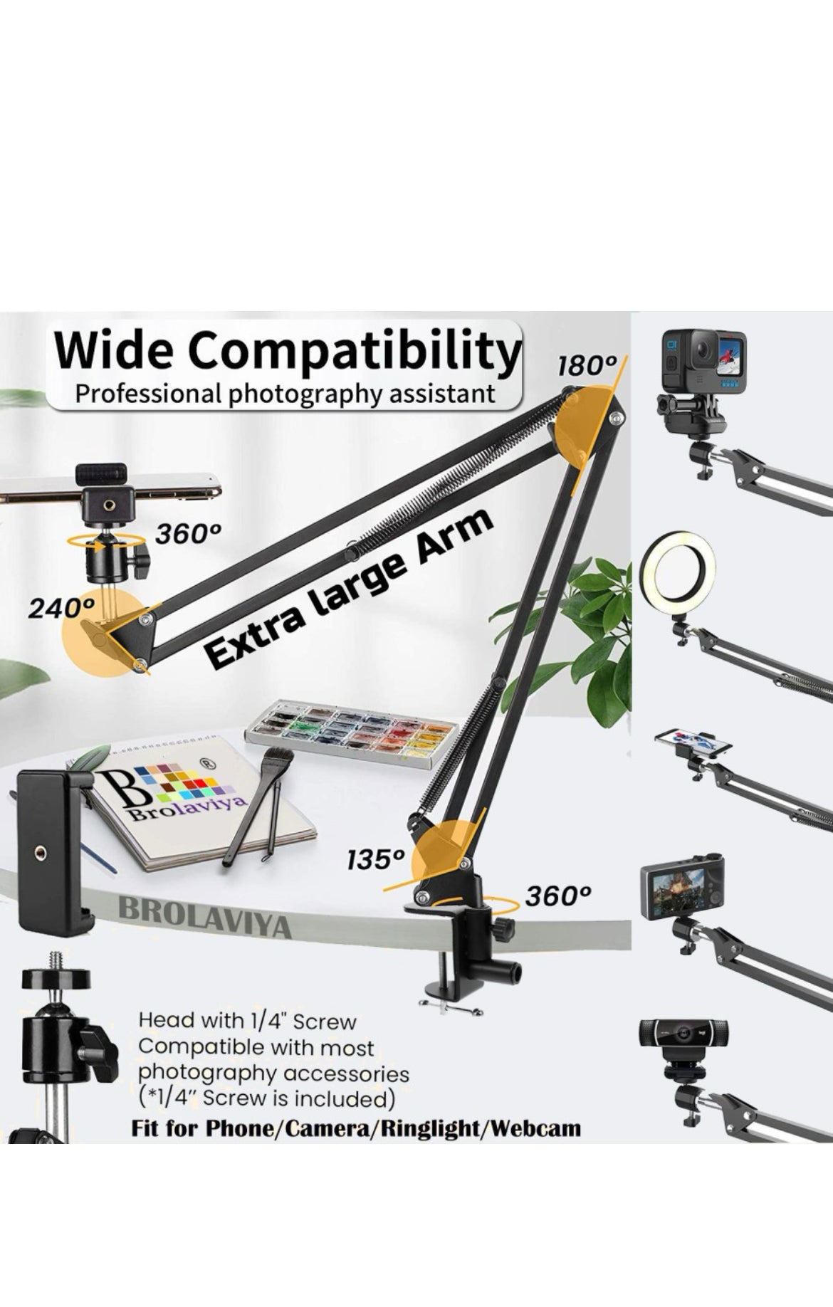 Largest Long Arm Brolaviya Stand: You can attach ring light, camera, webcam or go pro with 1/4? male adapter. 360 degree universal ball head, extendable, 180 degree adjustable and 360 degree rotatable suspension scissor arm, 240 degree up and down head. Brolaviya stand is made of high quality solid iron metal makes product sturdy enough to hold mobile firmly.