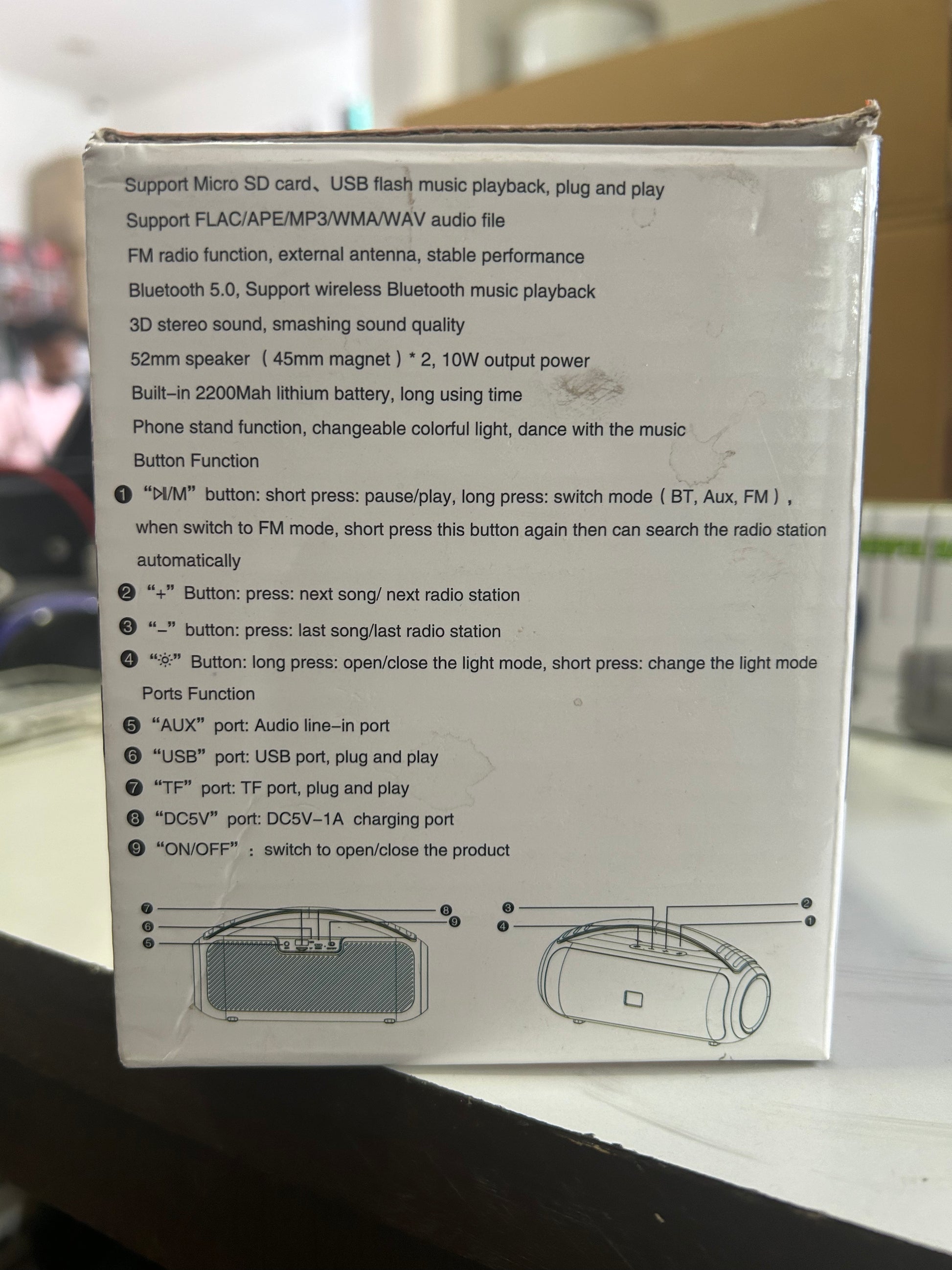 FM radio function, external antenna, stable performance Bluetooth 5.0, Support wireless Bluetooth music playback 3D stereo sound, smashing sound quality